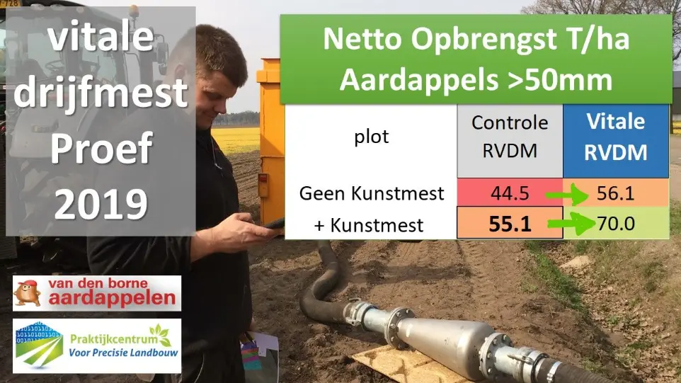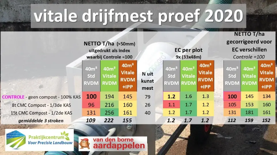 Zowel in 2019 als 2020 haalden we in aardappelproeven bij het PraktijkCentrum voor PrecisieLandbouw te Reusel een verbazende meeropbrengst door het vitaliseren van drijfmest . De proef van 2020 werd op een beregend perceel met erg lage EC uitgevoerd, met de gekende hete temperaturen. Het effect ven de gevitaliseerde drijfmest liep op tot +30% meer netto opbrengst, met vooral een duidelijk verschil in maatsortering.